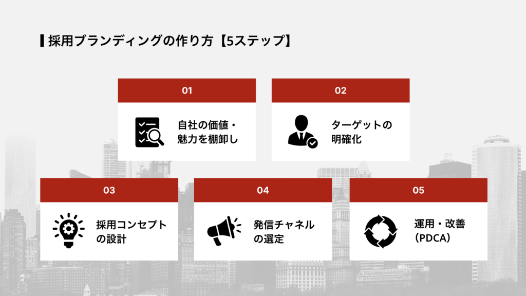 ここからは採用ブランディングを実践するための具体的な手順を解説します。5つのステップに分けて順番に進めていきましょう。