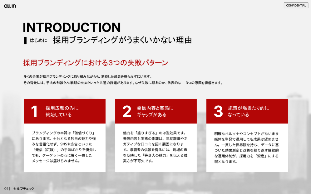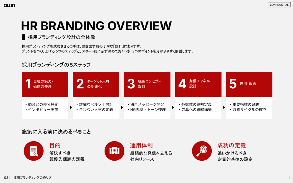 採用ブランディングを「一時の施策」で終わらせず、自社の継続的な採用力(資産)に変えるための実践ガイドです 。失敗に陥りやすい3つの原因の分析から、独自の魅力を引き出す5ステップの設計法、SNSやカルチャーデック等の具体的活用アイデアまでを体系的に解説 。自社に最適なブランディングの始め方と、ミスマッチを防ぎ成果を最大化させる運用のポイントを学べます 。