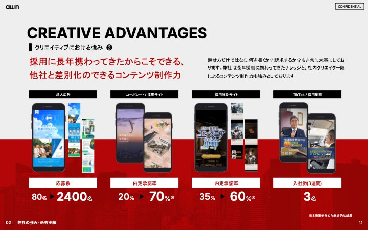 妥協なき戦略とクリエイティブで成果につなげた実例をまとめた資料です。ペルソナ設計やUSP抽出、差別化された表現設計により応募数・採用数を大幅改善したプロセスを具体的に解説。成果から逆算する求人広告の考え方と実践手法を学べます。