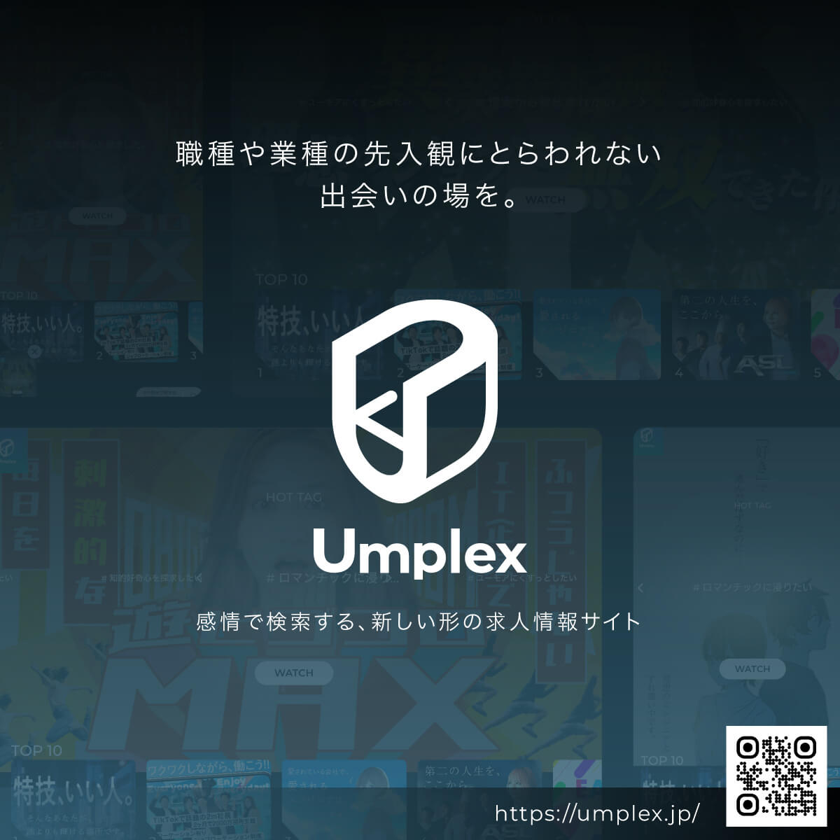 Umplexは、「今日は何を見ようかな」と映画やWeb漫画を選ぶような気持ちで”感情に寄り添った新しい出会い”をお届けします。検索軸は、「#ロマンチックに浸りたい」「#ユーモアにくすっとしたい」「#現実から解放されたい」などユニークなものばかり。紹介求人もデザインページが中心のため、心弾む気持ちで様々な仕事と出会えます。