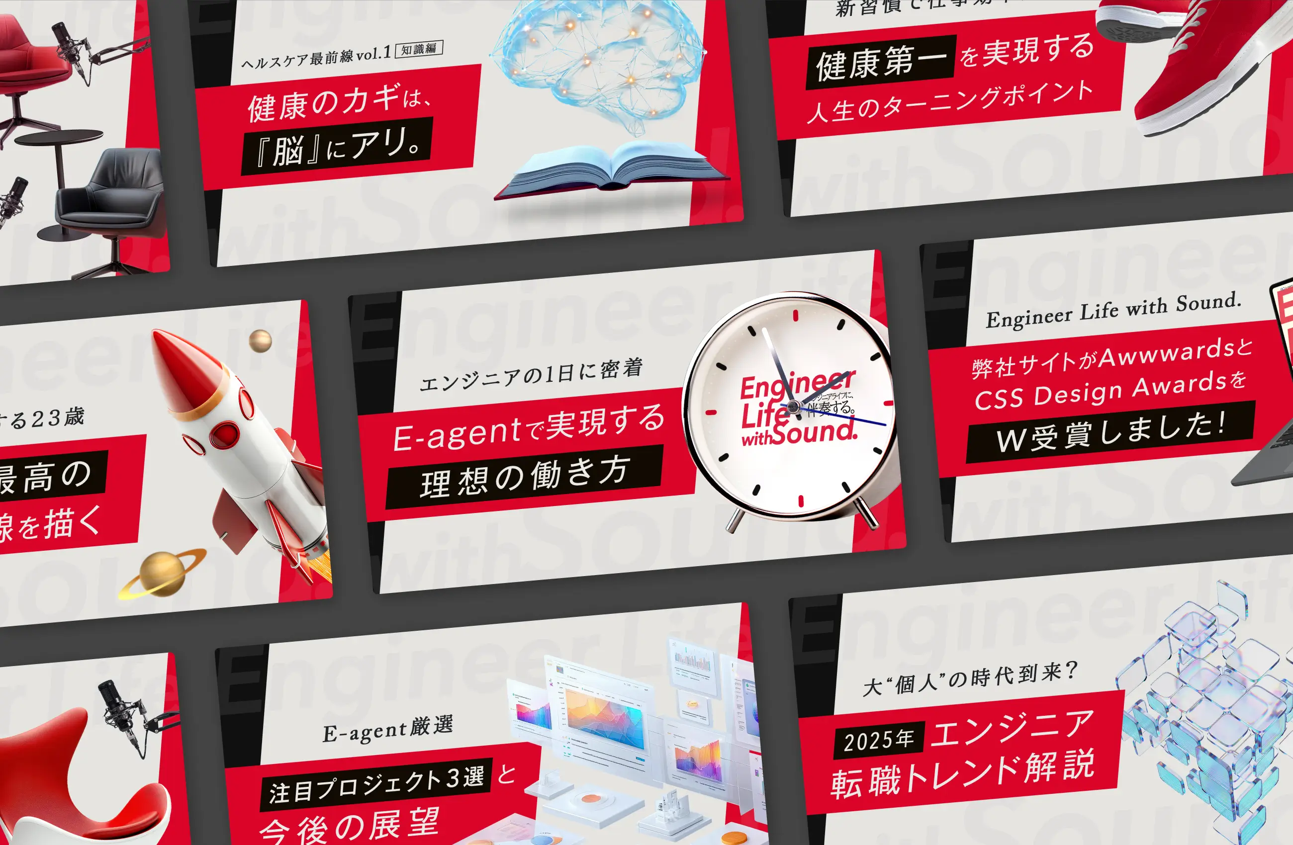 フリーランスエンジニアのリアルなスケジュール、健康管理の秘訣、IT業界の転職トレンド、最先端のAI技術など…記事のテーマは多岐にわたります。共通しているのは、「エンジニアが自身のキャリアに役立てられること」「エンジニアが楽しめるコンテンツであること」の2点。世の中の悩めるエンジニアが少しでも前向きに自分の将来と向き合えるような話題をピックアップし、企画に落とし込んでいます。制作にあたっては、E-agent株式会社・大橋代表のご協力もいただきながら所属エンジニアや専門家の方への取材も実施。同社の志をさらに言語化すべく、これからも濃密に伴走していきます。